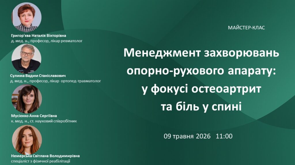 Запрошуємо колег на майстер-клас “Менеджмент захворювань опорно-рухового апарату: у фокусі остеоартрит та біль у спині”, який відбудеться 09 травня 2026 р. Початок 11.00 год.